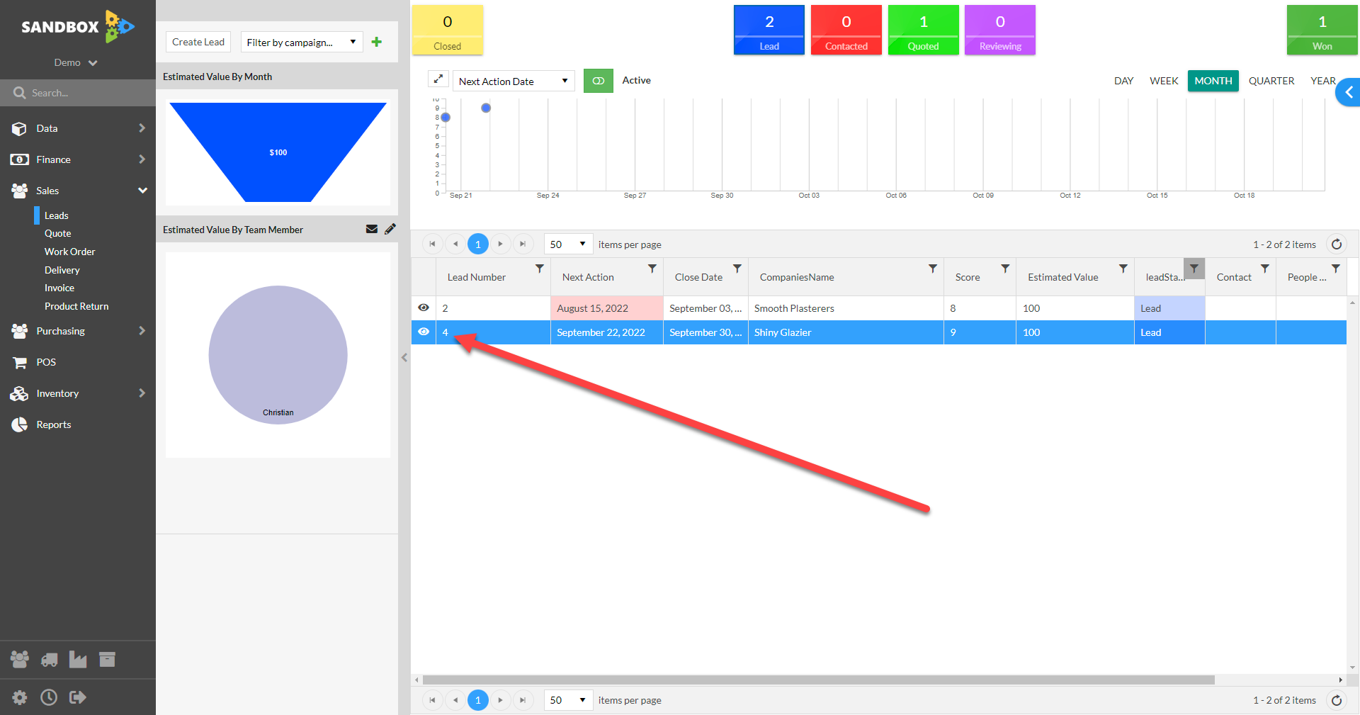 As you can see below, lead #4 for Shiny Glazier has been added to the pipeline until the inital "Lead" stage.