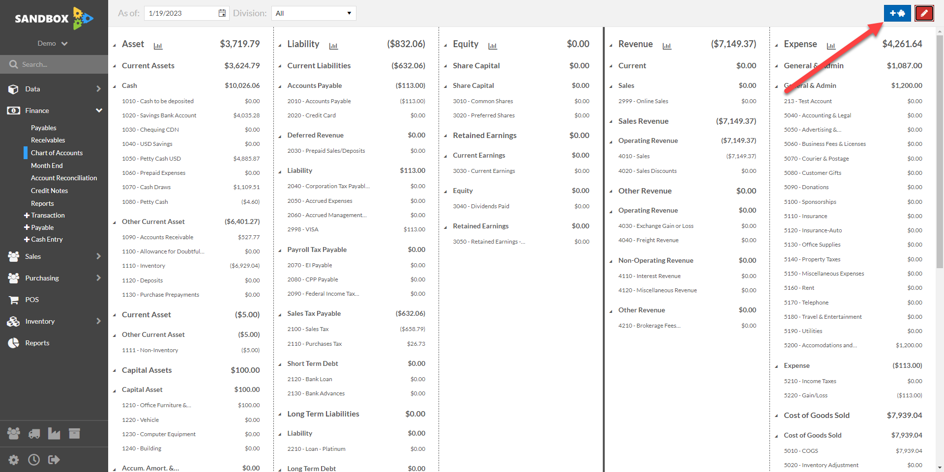 To create or edit existing GL accounts, you need to first put your Chart of Accounts in Edit Mode. To do this first click the "Pencil" icon in the top right corner.